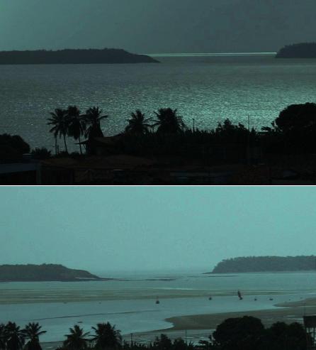 Uma foto retratando as marés em São Luís, capital maranhense. Na primeira foto, maré cheia, barcos navegam, transportam carga e passageiros. Na foto debaixo, mostrando uma localidade vizinha a da primeira foto, maré baixa.