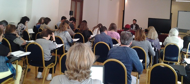 colegas durante preleção de abertura